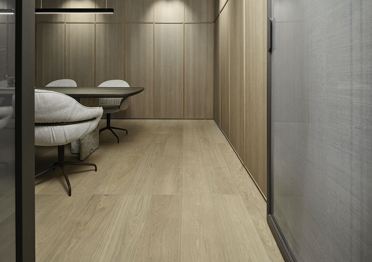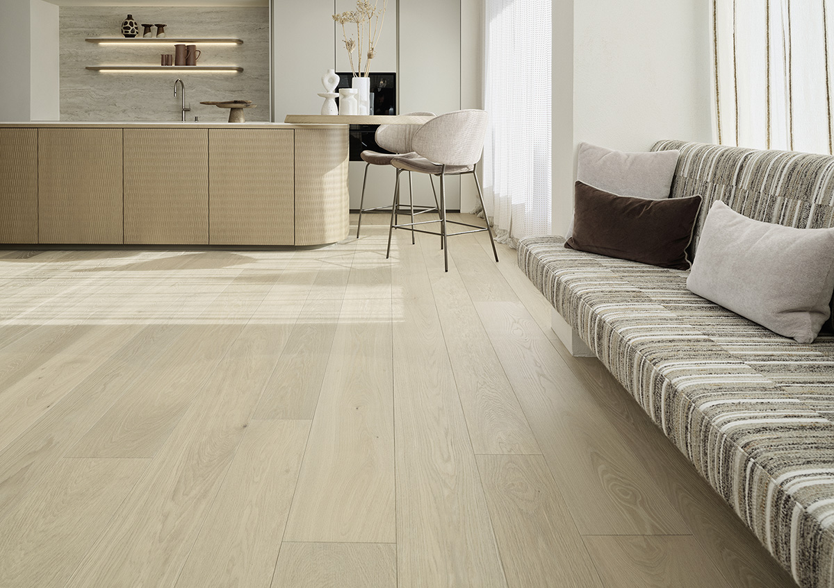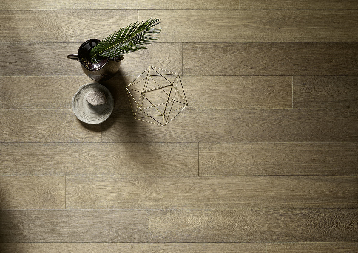 Wirkung kommen. Durch die matte Veredelung der Oberfläche und sein breites Dielenformat, macht er Räume zu würdevollen Inseln der Ruhe und Kraft.